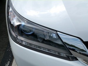 The 2014 Honda Accord Hybrid has rear camera parking distance sensors. It has halogen headlights with projector beam lenses, headlight control with dusk sensor, front fog lights, and intermittent windshield wipers. It has front and rear airbags, and height-adjustable head restraints. The front seatbelts are height-adjustable with pre-tensioners, and the rear seatbelts have a 3-point center belt.
